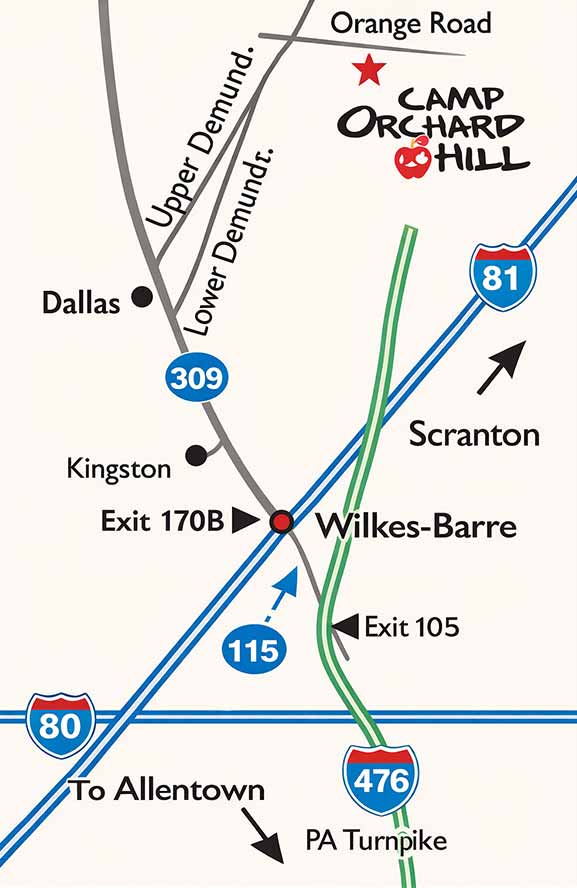 80 West to Exit 284 (Route 115 North) . Make a right unto 115. Take 115 until it turns into Rt. 309 North (about 20 miles). Follow 309 North crossing the Susquehanna River to the Dallas Shopping Center (about 10-15 minutes outside of Wilkes-Barre). Route 309 will bear right. Continue on Route 309 to the second traffic light. Make a right turn onto Upper Demunds Road and proceed on this road for 1.5 miles. The road will bear left and continue another 1.2 miles to a stop sign. Turn left (Lower Demunds Road) and proceed 1.4 miles to Orange Road. Turn right onto Orange Road and go .5 miles to the Camp Entrance.